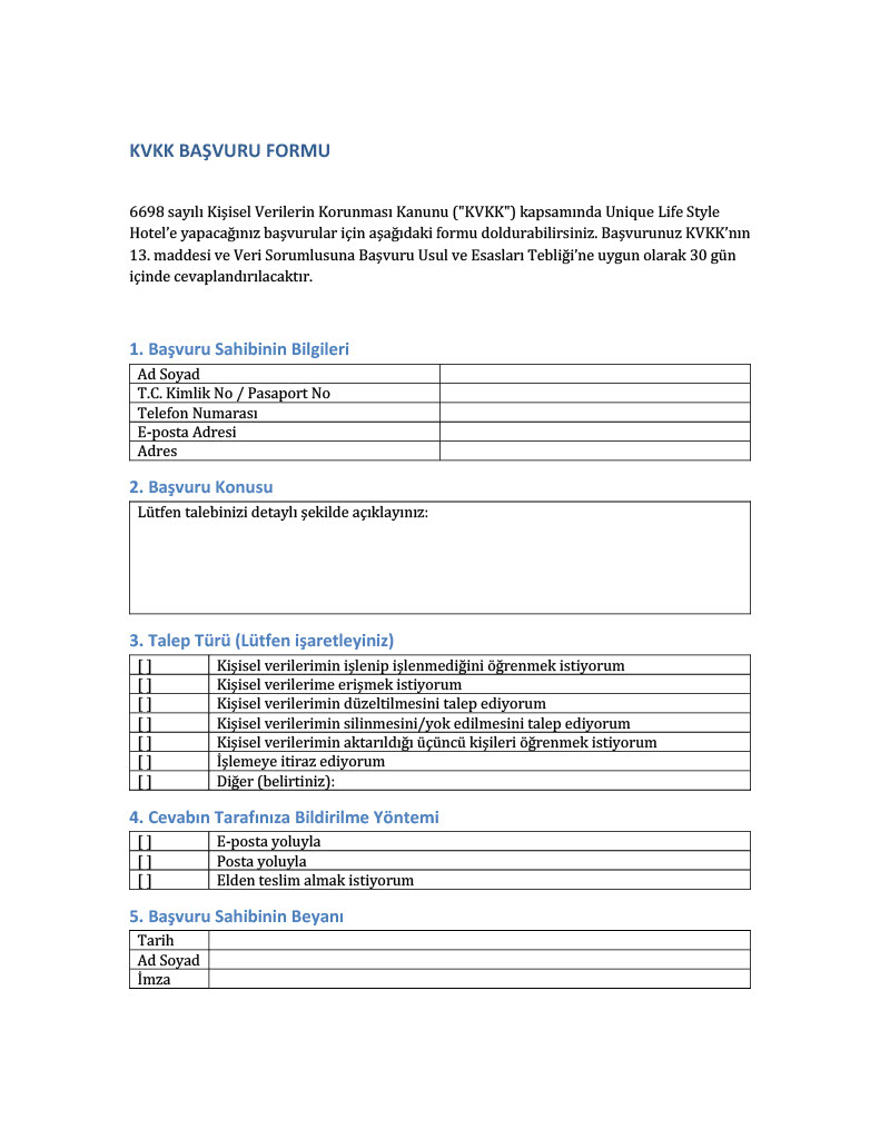 üzerinden “KVKK Başvuru Formu” ile iletebilirsiniz. Başvurularınız 30 gün içinde sonuçlandırılır.